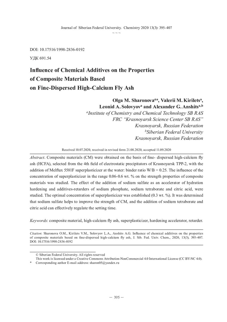 Библиографическое описание:Влияние химических добавок на свойства композитных материалов на основе тонкодисперсной высококальциевой летучей золы = Influence of chemical additives on the properties of composite materials based on fine-dispersed high-calcium fly ash / О. М. Шаронова, В. М. Кирилец, Л. А. Соловьев, А. Г. Аншиц. - Текст : непосредственный // Журнал Сибирского федерального университета. Химия. - 2020. - Т. 13, № 3. - С. 395-407 : ил. - Библиогр.: с. 406-407 (22 назв.). - ISSN 1998-2836.