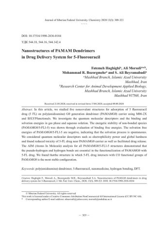Аннотация:В этой статье мы изучили пять нековалентных структур для адсорбции лекарственного средства 5-фторурацила (5 FL) на носителе дендримеров поколения поли (амидоамина) G0 (PAMAMG0) с использованием функционалов M06-2X и B3LYP.