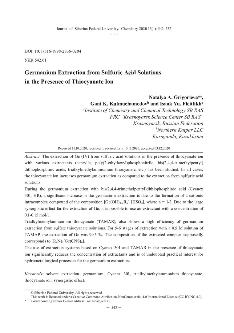 Библиографическое описание:Григорьева, Н. А. Экстракция германия из сернокислых растворов в присутствии роданид-иона = Germanium extraction from sulfuric acid solutions in the presence of thiocyanate ion / Н. А. Григорьева, Г. К. Кулмухамедов, И. Ю. Флейтлих. - Текст : непосредственный // Журнал Сибирского федерального университета. Химия. - 2020. - Т. 13, № 4. - С. 542-552 : ил. - Библиогр.: с. 551-552 (19 назв.). - ISSN 1998-2836.