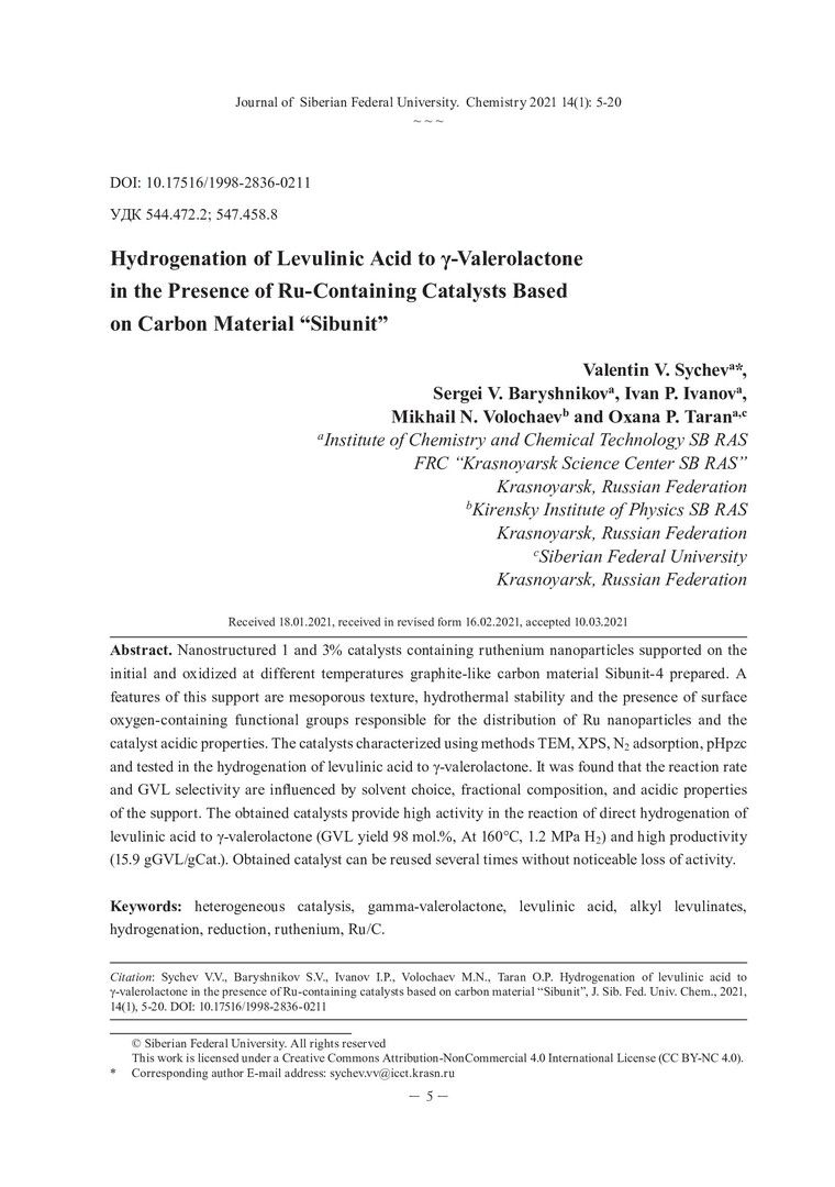 Библиографическое описание:Hydrogenation of Levulinic Acid to гамма-Valerolactone in the Presence of Ru-Containing Catalysts Based on Carbon Material “Sibunit” = Гидрирование левулиновой кислоты до гамма-валеролактона в присутствии Ru-содержащих катализаторов на основе углеродного материала сибунит / В. В. Сычев, С. В. Барышников, И. П. Иванов, М. Н. Волочаев, О. П. Таран [и др.]. - Текст : непосредственный // Журнал Сибирского федерального университета. Химия. - 2021. - Т. 14, № 1. - С. 5-20. - Библиогр.: с. 18-20 (28 назв.). - ISSN 1998-2836.