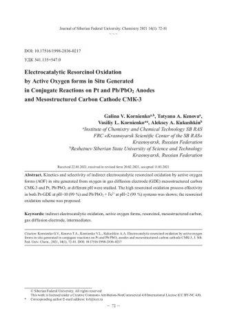 Непрямое электрокаталитическое окисление резорцина активными формами кислорода, in situ генерированными в сопряженных реакциях на анодах из Pt и Pb/PbO[2] и катоде из мезоструктурированного углерода СМК-3