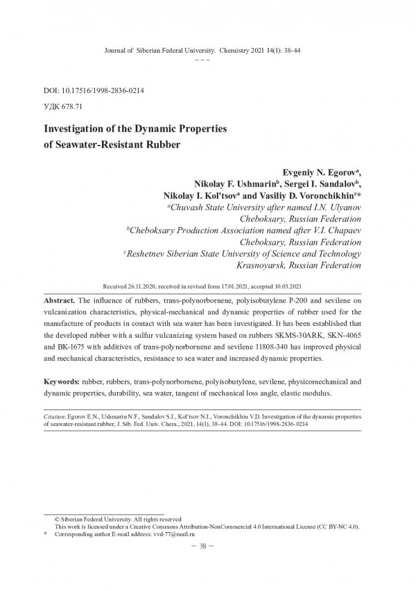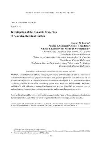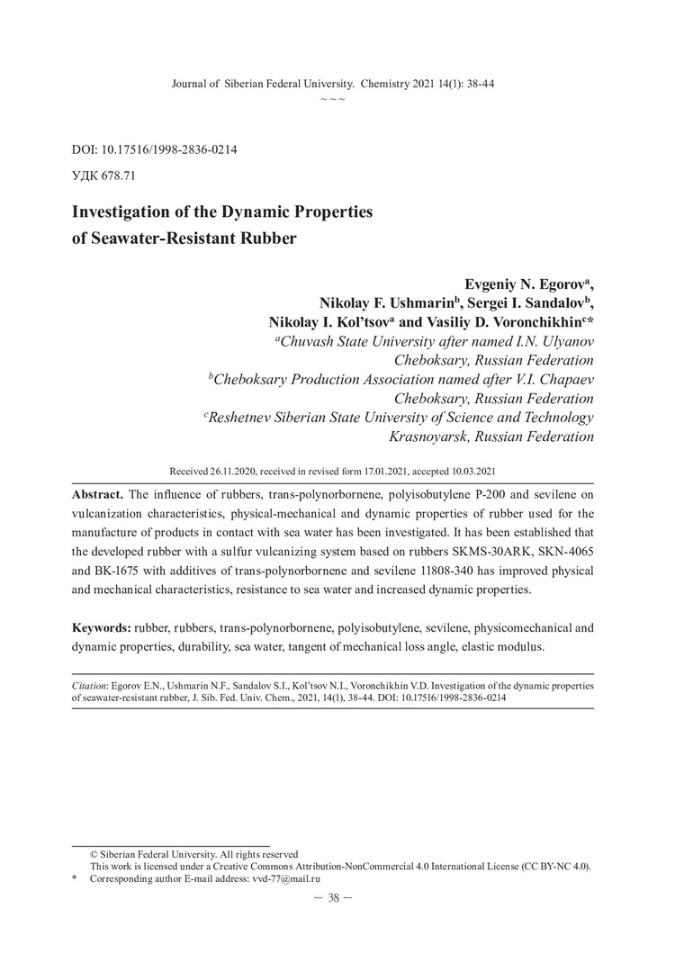 Библиографическое описание:Исследование динамических свойств стойкой к морской воде резины = Investigation of the Dynamic Properties of Seawater-Resistant Rubber / Е. Н. Егоров, Н. Ф. Ушмарин, С. И. Сандалов [и др.]. - Текст : непосредственный // Журнал Сибирского федерального университета. Химия. - 2021. - Т. 14, № 1. - С. 38-44. - Библиогр.: с. 43-44 (16 назв.). - ISSN 1998-2836.