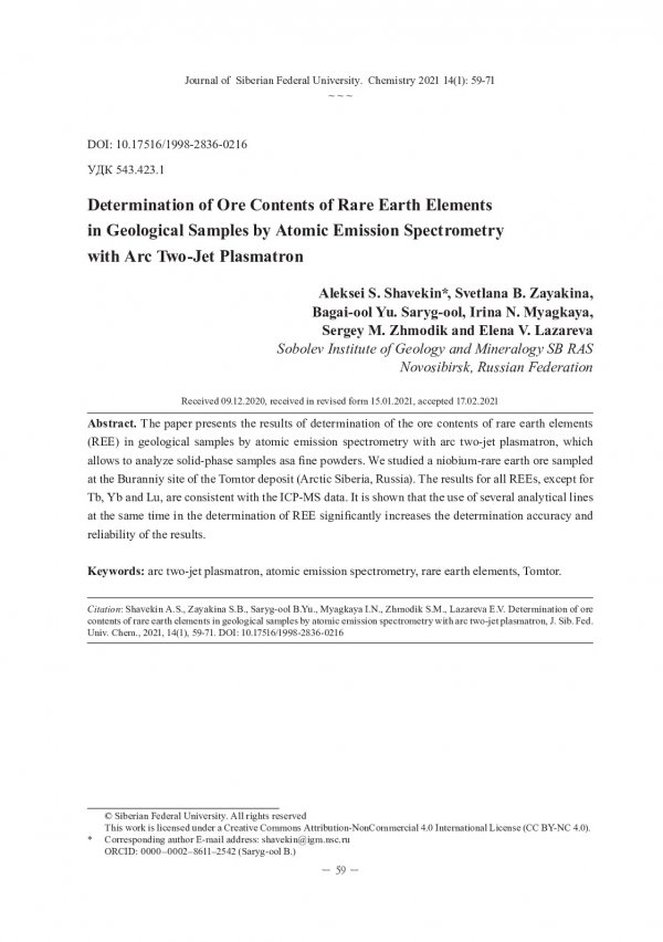 Библиографическое описание:Определение рудных содержаний редкоземельных элементов в геологических образцах методом атомно-эмиссионной спектрометрии с дуговым двухструйным плазмотроном = Determination of Ore Contents of Rare Earth Elements in Geological Samples by Atomic Emission Spectrometry with Arc Two-Jet Plasmatron / А. С. Шавекин, С. Б. Заякина, Б. Ю. Сарыг-оол [и др.]. - Текст : непосредственный // Журнал Сибирского федерального университета. Химия. - 2021. - Т. 14, № 1. - С. 59-71. - Библиогр.: с. 68-71 (35 назв.). - ISSN 1998-2836.