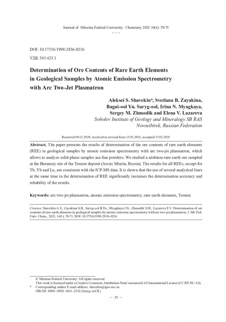 Аннотация:В работе приведены результаты определения рудных содержаний редкоземельных элементов (РЗЭ) в геологических образцах методом атомно-эмиссионной спектрометрии с дуговым двухструйным плазматроном, позволяющей проводить анализ твердофазных образцов в виде мелкодисперсных порошков.