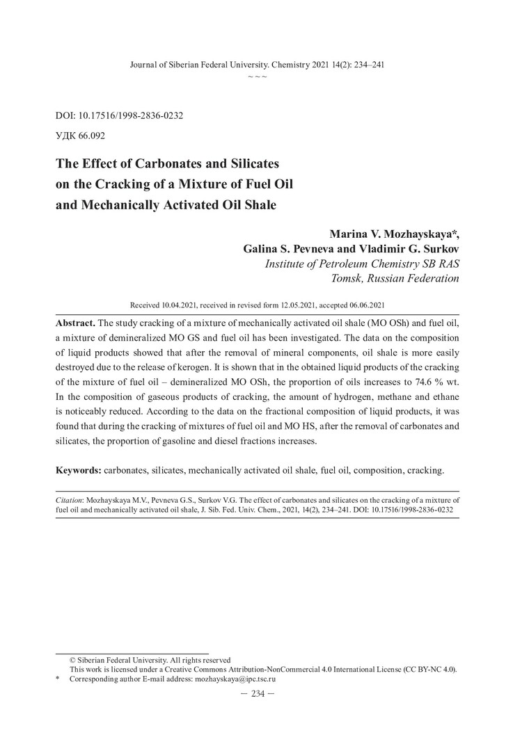 Библиографическое описание:Можайская, М. В. Влияние карбонатов и силикатов на крекинг смеси мазута и механоактивированного горючего сланца = The Effect of Carbonates and Silicates on the Cracking of a Mixture of Fuel Oil and Mechanically Activated Oil Shale / М. В. Можайская, Г. С. Певнева, В. Г. Сурков. - Текст : непосредственный // Журнал Сибирского федерального университета. Химия. - 2021. - Т. 14, № 2. - С. 234-241. - Библиогр.: с. 240-241 (18 назв.). - ISSN 1998-2836.