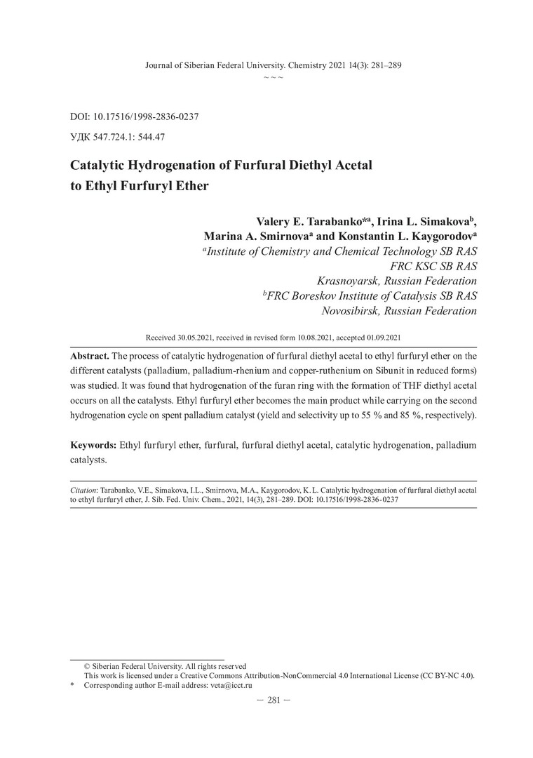 Библиографическое описание:Catalytic hydrogenation of furfural diethyl acetal to ethyl furfuryl ether = Каталитическое гидрирование диэтилацеталя фурфурола в этилфурфуриловый эфир / V. E. Tarabanko, I. L. Simakova, M. A. Smirnova, K. L. Kaygorodov. - Текст : непосредственный // Журнал Сибирского федерального университета. Химия. - 2021. - Т. 14, № 3. - С. 281-289. - Библиогр.: с. 288-289 (27 назв.). - ISSN 1998-2836.