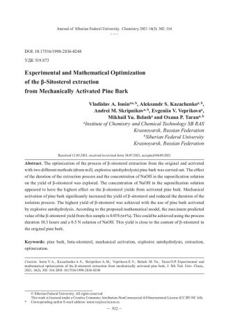Библиографическое описание:Experimental and mathematical optimization of the Бета-sitosterol extraction from mechanically activated pine bark = Экспериментальная и математическая оптимизация процесса выделения Бета-ситостерина из механически активированной коры сосны / V. А. Ionin, A. S. Kazachenko, А. М. Skripnikov [et al.]. - Текст : непосредственный // Журнал Сибирского федерального университета. Химия. - 2021. - Т. 14, № 3. - С. 302-314. - Библиогр.: с. 312-314 (20 назв.). - ISSN 1998-2836.