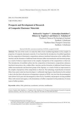 Библиографическое описание:Prospects and development of research of composite elastomer materials = Исследования наполненных композиционных эластомерных материалов / B. B. Yoqubov, Akhmadjon Ibadullaev, D. Q. Yoqubova, E. U. Teshabaeva. - Текст : непосредственный // Журнал Сибирского федерального университета. Химия. - 2021. - Т. 14, № 4. - С. 464-476. - Библиогр.: с. 474-476 (20 назв.). - ISSN 1998-2836.