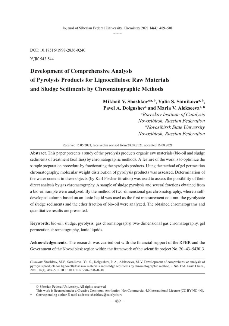 Библиографическое описание:Разработка комплексного анализа продуктов пиролиза лигноцеллюлозного сырья и иловых осадков хроматографическими методами = Development of comprehensive analysis of pyrolysis products for lignocellulose raw materials and sludge sediments by chromatographic methods / М. В. Шашков, Ю. С. Сотникова, П. А. Долгушев, М. В. Алексеева. - Текст : непосредственный // Журнал Сибирского федерального университета. Химия. - 2021. - Т. 14, № 4. - С. 489-501. - Библиогр.: с. 499-501 (21 назв.). - ISSN 1998-2836.
