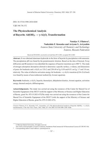 Библиографическое описание:Филатова, Н. В. The Physicochemical Analysis of Bayerite Al(OH)[3] in гамма-Al[2]O[3] Transformation = Физико-химический анализ перехода байерита Al(OH)[3] в гамма-Al[2]O[3] / N. V. Filatova, N. F. Kosenko, A. S. Artyushin. - Текст : непосредственный // Журнал Сибирского федерального университета. Химия. - 2021. - Т. 14, № 4. - С. 527-538. - Библиогр.: с. 536-538 (33 назв.). - ISSN 1998-2836.