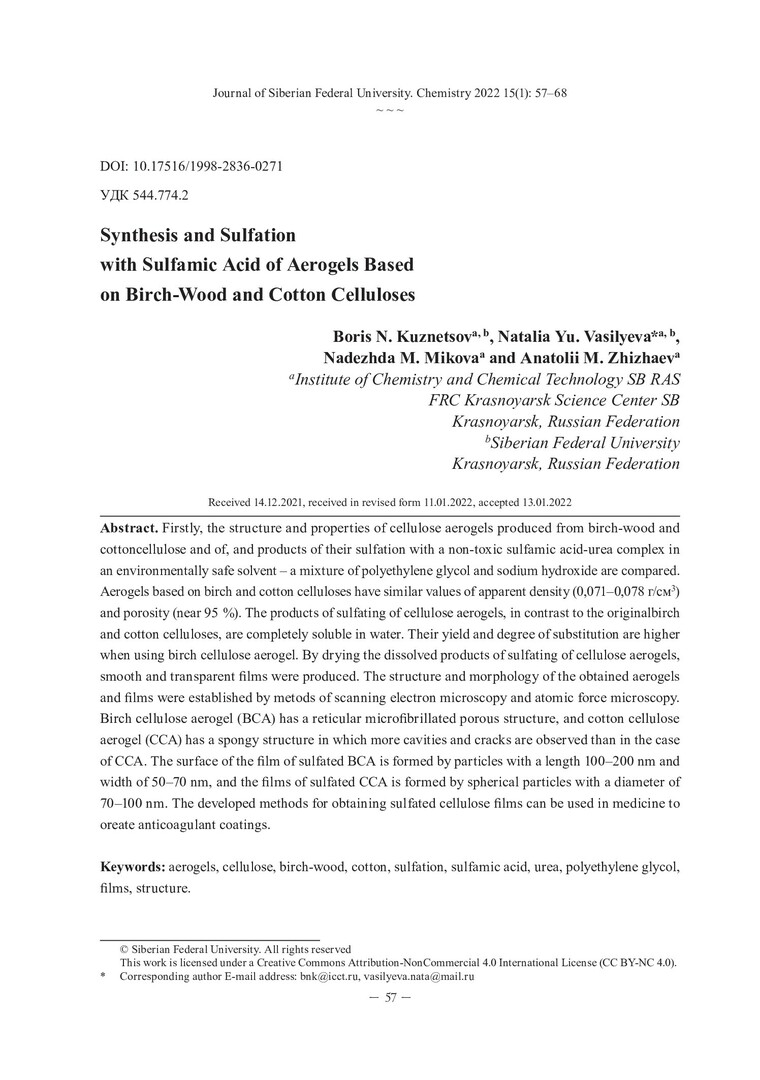 Библиографическое описание:Синтез и сульфатирование сульфаминовой кислотой аэрогелей из целлюлоз древесины березы и хлопка = Synthesis and Sulfation with Sulfamic Acid of Aerogels Based on Birch-Wood and Cotton Celluloses / Б. Н. Кузнецов, Н. Ю. Васильева, Н. М. Микова, А. М. Жижаев. - Текст : непосредственный // Журнал Сибирского федерального университета. Химия. - 2022. - Т. 15, № 1. - С. 57-68. - Библиогр.: с. 67-68 (19 назв.). - ISSN 1998-2836.