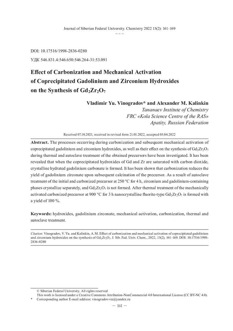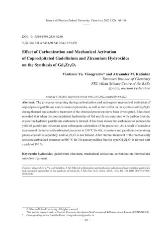 Библиографическое описание:Vinogradov, V. Yu. Effect of Carbonization and Mechanical Activation of Coprecipitated Gadolinium and Zirconium Hydroxides on the Synthesis of Gd[2]Zr[2]O[7] = Влияние карбонизации и механоактивации совместно осажденных гидроксидов гадолиния и циркония на синтез Gd[2]Zr[2]O[7] / Vladimir Yu. Vinogradov, A. M. Kalinkin. - Текст : непосредственный // Журнал Сибирского федерального университета. Химия. - 2022. - Т. 15, № 2. - С. 161-169. - Библиогр.: с. 168-169 (9 назв.). - ISSN 1998-2836.