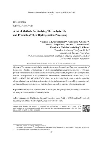 Библиографическое описание:Комплекс методов для изучения термолизных масел и продуктов их гидрогенизационной переработки = A Set of Methods for Studying Thermolysis Oils and Products of Their Hydrogenation Processing / В. С. Крестьянинова, А. В. Сайко, П. А. Долгушев [и др.]. - Текст : непосредственный // Журнал Сибирского федерального университета. Химия. - 2023. - Т. 16, № 1. - С. 87-95. - Библиогр.: с. 94-95 (11 назв.). - ISSN 1998-2836.