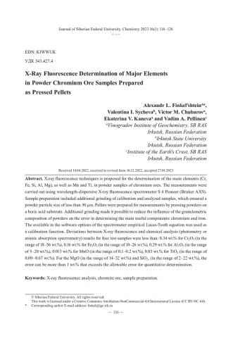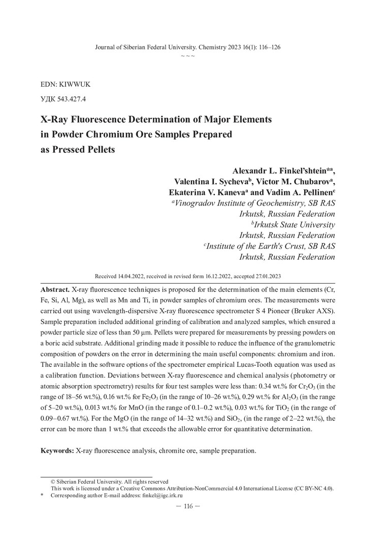 Библиографическое описание:Рентгенофлуоресцентное определение основных элементов хромовых руд в прессованных порошковых пробах = X-Ray Fluorescence Determination of Major Elements in Powder Chromium Ore Samples Prepared as Pressed Pellets / А. Л. Финкельштейн, В. И. Сычева, В. М. Чубаров [и др.]. - Текст : непосредственный // Журнал Сибирского федерального университета. Химия. - 2023. - Т. 16, № 1. - С. 116-126. - Библиогр.: с. 124-126 (20 назв.). - ISSN 1998-2836.