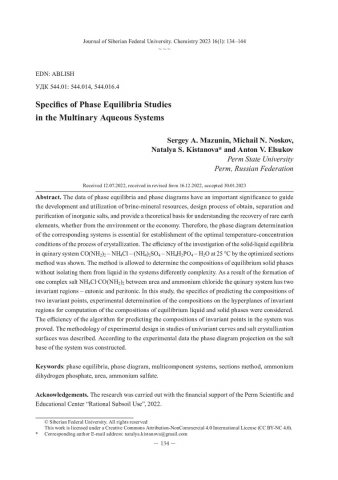 Библиографическое описание:Особенности исследований фазовых равновесий в многокомпонентных водных системах = Specifics of Phase Equilibria Studies in the Multinary Aqueous Systems / С. А. Мазунин, М. Н. Носков, Н. С. Кистанова, А. В. Елсуков. - Текст : непосредственный // Журнал Сибирского федерального университета. Химия. - 2023. - Т. 16, № 1. - С. 134-144. - Библиогр.: с. 143-144 (25 назв.). - ISSN 1998-2836.