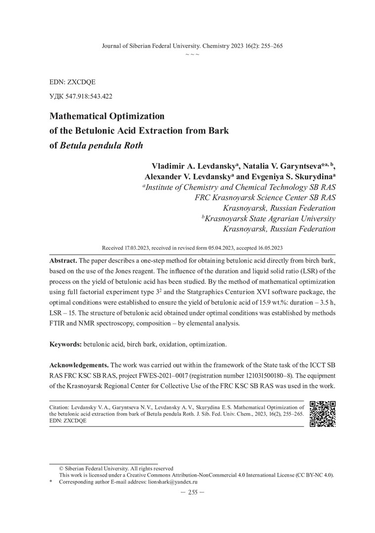 Библиографическое описание:Математическая оптимизация процесса получения бетулоновой кислоты из бересты коры Betula pendula Roth = Mathematical Optimization of the Betulonic Acid Extraction from Bark of Betula pendula Roth / В. А. Левданский, Н. В. Гарынцева, А. В. Левданский, Е. С. Скурыдина. - Текст : непосредственный // Журнал Сибирского федерального университета. Химия. - 2023. - Т. 16, № 2. - С. 255-265. - Библиогр.: с. 264-265 (18 назв.). - ISSN 1998-2836.