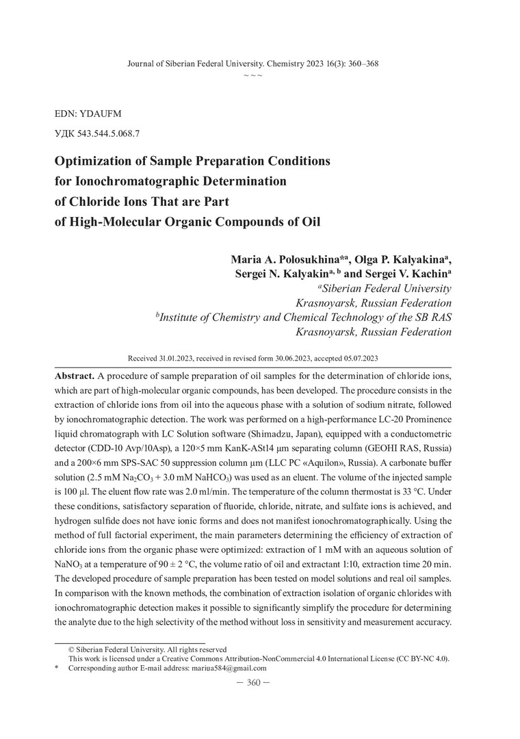 Библиографическое описание:Optimization of Sample Preparation Conditions for Ionochromatographic Determination of Chloride Ions That are Part of High-Molecular Organic Compounds of Oil = Оптимизация условий пробоподготовки для ионохроматографического определения хлорид-ионов, входящих в состав высокомолекулярных органических соединений нефти / M. A. Polosukhina, O. P. Kalyakina, S. N. Kalyakin, S. V. Kachin. - Текст : непосредственный // Журнал Сибирского федерального университета. Химия. - 2023. - Т. 16, № 3. - С. 360-368. - Библиогр.: с. 366-368 (18 назв.). - ISSN 1998-2836.