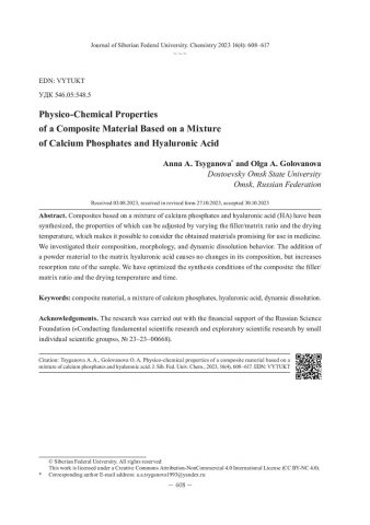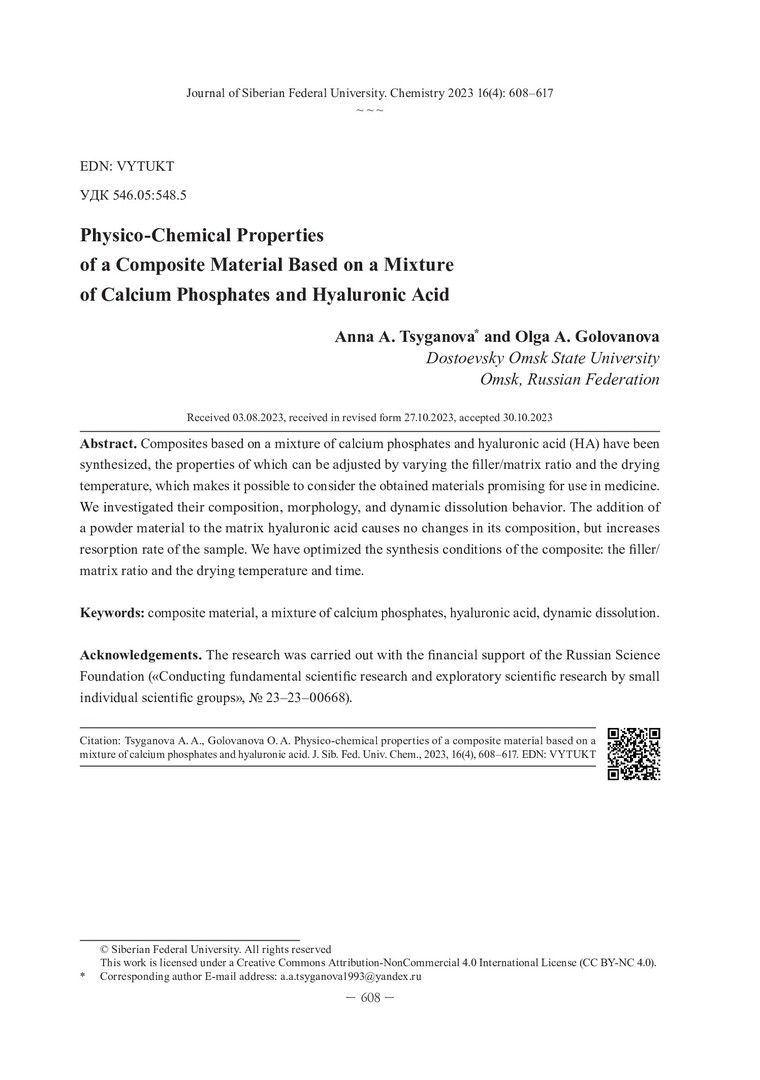 Библиографическое описание:Цыганова, А. А. Физико-химические свойства композиционного материала на основе смеси фосфатов кальция и гиалуроновой кислоты = Physico-Chemical Properties of a Composite Material Based on a Mixture of Calcium Phosphates and Hyaluronic Acid / А. А. Цыганова, О. А. Голованова. - Текст : непосредственный // Журнал Сибирского федерального университета. Химия. - 2023. - Т. 16, № 4. - С. 608-617. - Библиогр.: с. 616-617 (6 назв.). - ISSN 1998-2836.