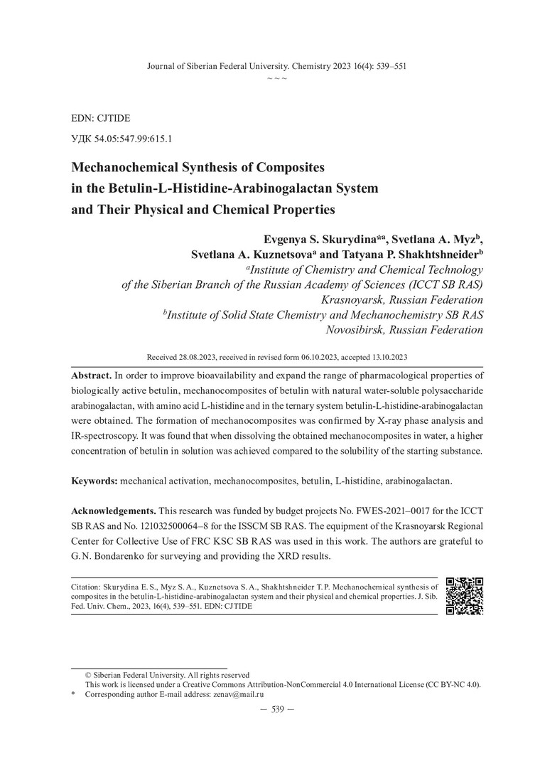 Библиографическое описание:Механохимический синтез композитов в системе бетулин-L-гистидин-арабиногалактан и их физико-химические свойства = Mechanochemical Synthesis of Composites in the Betulin-L-Histidine-Arabinogalactan System and Their Physical and Chemical Properties / Е. С. Скурыдина, С. А. Мызь, С. А. Кузнецова, Т. П. Шахтшнейдер. - Текст : непосредственный // Журнал Сибирского федерального университета. Химия. - 2023. - Т. 16, № 4. - С. 539-551. - Библиогр.: с. 549-551 (17 назв.). - ISSN 1998-2836.