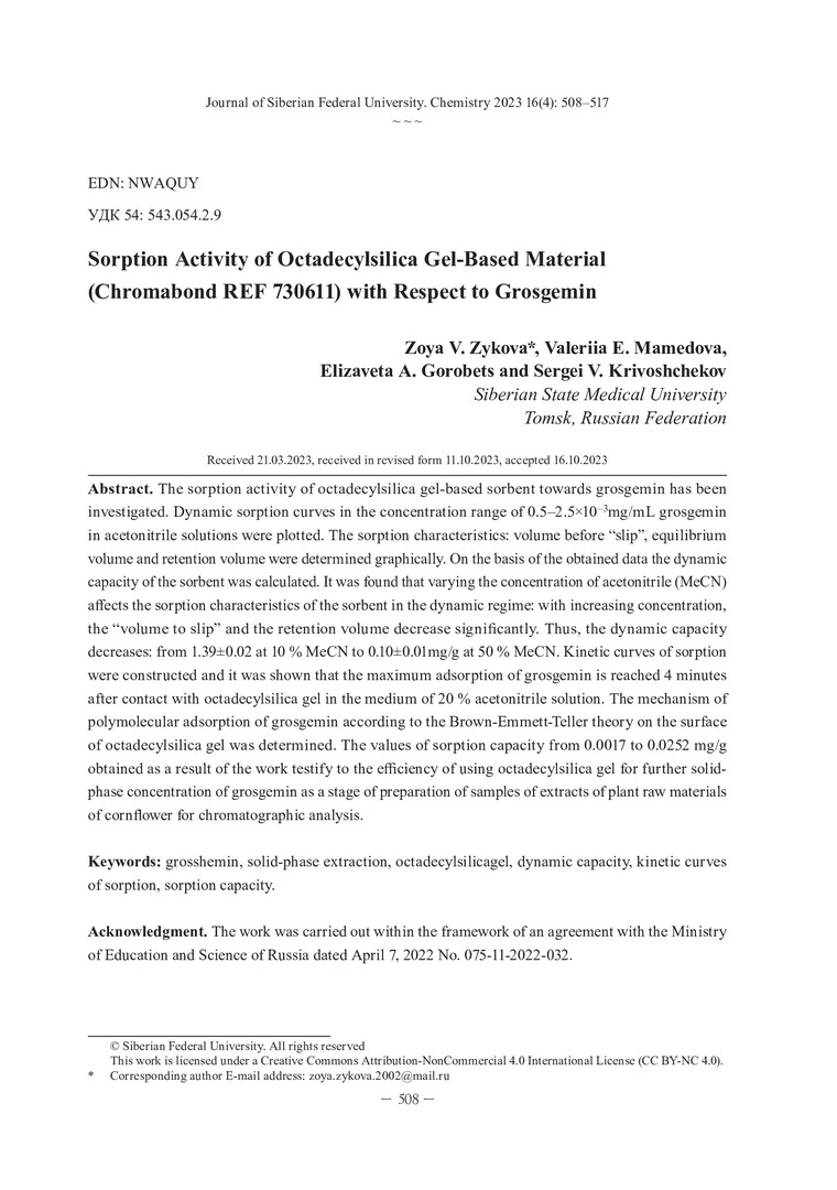 Библиографическое описание:Сорбционная активность материала на основе октадецилсиликагеля (Сhromabond REF 730611) по отношению к гроссгемину = Sorption Activity of Octadecylsilica Gel-Based Material (Chromabond REF 730611) with Respect to Grosgemin / З. В. Зыкова, В. Э. Мамедова, Е. А. Горобец, С. В. Кривощеков. - Текст : непосредственный // Журнал Сибирского федерального университета. Химия. - 2023. - Т. 16, № 4. - С. 508-517. - Библиогр.: с. 516-517 (14 назв.). - ISSN 1998-2836.