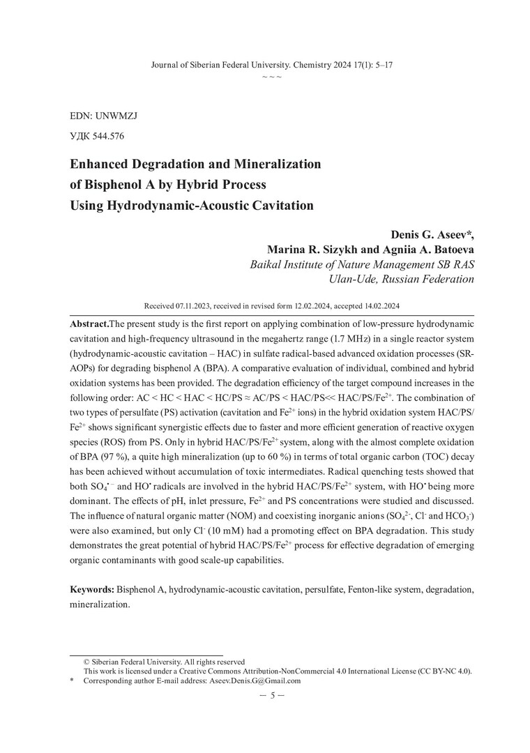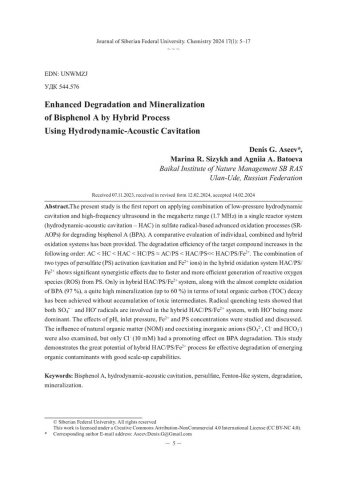 Библиографическое описание:Aseev, Denis G... Enhanced Degradation and Mineralization of Bisphenol A by Hybrid Process Using Hydrodynamic-Acoustic Cavitation = Кавитационная активация процессов деструкции и минерализации Бисфенола А / D. G. Aseev, M. R. Sizykh, A. A. Batoeva. - Текст : непосредственный // Журнал Сибирского федерального университета. Химия. - 2024. - Т. 17, № 1. - С. 5-17. - Библиогр.: с. 15-17 (35 назв.). - ISSN 1998-2836.