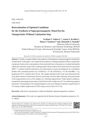 Библиографическое описание:Определение оптимальных условий синтеза суперпарамагнитных наночастиц феррита никеля без стадии прокаливания = Determination of Optimal Conditions for the Synthesis of Superparamagnetic Nickel Ferrite Nanoparticles Without Calcination Step / С. В. Сайкова, А. Е. Кроликов, Д. И. Немкова, А. С. Самойло. - Текст : непосредственный // Журнал Сибирского федерального университета. Химия. - 2024. - Т. 17, № 1. - С. 151-161. - Библиогр.: с. 160-161 (28 назв.). - ISSN 1998-2836.