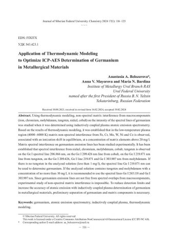 Библиографическое описание:Белозерова, А. А. Применение термодинамического моделирования для оптимизации ИСП-АЭС определения германия в металлургических материалах = Application of Thermodynamic Modeling to Optimize ICP-AES Determination of Germanium in Metallurgical Materials / А. А. Белозерова, М. В. Майорова, М. Н. Бардина. - Текст : непосредственный // Журнал Сибирского федерального университета. Химия. - 2024. - Т. 17, № 1. - С. 116-125. - Библиогр.: с. 124-125 (11 назв.). - ISSN 1998-2836.