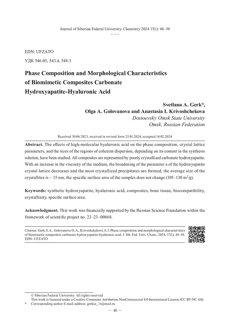 Библиографическое описание:Герк, С. А. Фазовый состав и морфологические характеристики биомиметических композитов карбонатгидроксиапатит-гиалуроновая кислота = Phase Composition and Morphological Characteristics of Biomimetic Composites Carbonate Hydroxyapatite-Hyaluronic Acid / С. А. Герк, О. А. Голованова, A. И. Кривощекова. - Текст : непосредственный // Журнал Сибирского федерального университета. Химия. - 2024. - Т. 17, № 1. - С. 48-58. - Библиогр.: с. 57-58 (11 назв.). - ISSN 1998-2836.