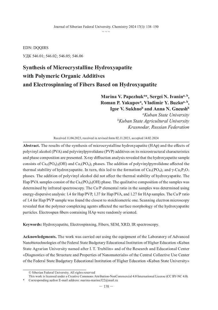 Библиографическое описание:Синтез микрокристаллического гидроксиапатита с полимерными органическими добавками и получение волокон на его основе методом электроформования = Synthesis of Microcrystalline Hydroxyapatite with Polymeric Organic Additives and Electrospinning of Fibers Based on Hydroxyapatite / М. В. Папежук, С. Н. Иванин, Р. П. Якупов [и др.]. - Текст : непосредственный // Журнал Сибирского федерального университета. Химия. - 2024. - Т. 17, № 1. - С. 138-150. - Библиогр.: с. 148-150 (39 назв.). - ISSN 1998-2836.