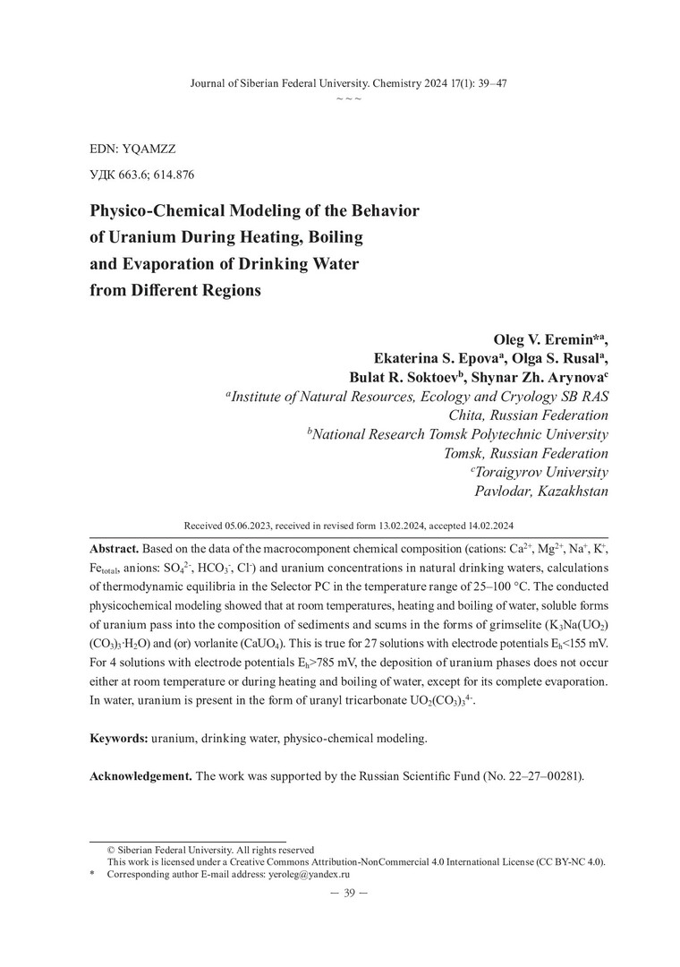 Библиографическое описание:Физико-химическое моделирование поведения урана при нагревании, кипячении и выпаривании питьевых вод разных регионов = Physico- Chemical Modeling of the Behavior of Uranium During Heating, Boiling and Evaporation of Drinking Water from Different Regions / О. В. Еремин, Е. С. Эпова, О. С. Русаль [и др.]. - Текст : непосредственный // Журнал Сибирского федерального университета. Химия. - 2024. - Т. 17, № 1. - С. 39-47. - Библиогр.: с. 45-47 (22 назв.). - ISSN 1998-2836.