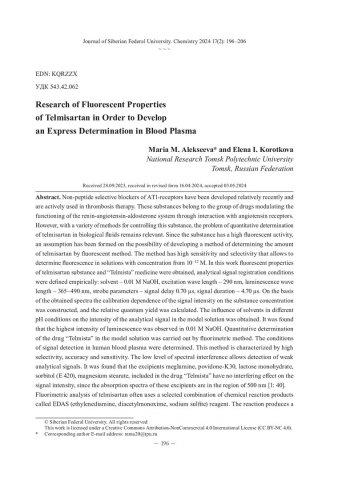 Библиографическое описание:Alekseeva, M. M. Research of Fluorescent Properties of Telmisartan in Order to Develop an Express Determination in Blood Plasma = Исследование флуоресцентных свойств телмисартана с целью разработки экспресс-определения в плазме крови / M. M. Alekseeva, E. I. Korotkova. - Текст : непосредственный // Журнал Сибирского федерального университета. Химия. - 2024. - Т. 17, № 2. - С. 196-206. - Библиогр.: с. 205-206 (12 назв.). - ISSN 1998-2836.