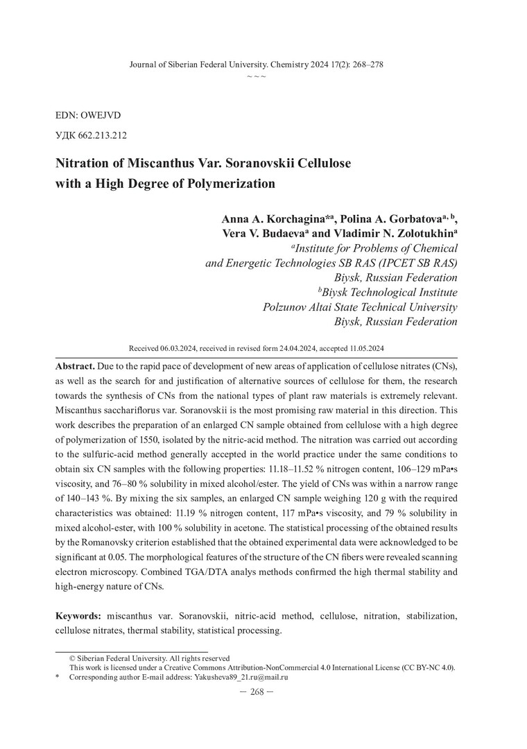 Библиографическое описание:Нитрование целлюлозы с высокой степенью полимеризации из мискантуса сорта Сорановский = Nitration of Miscanthus Var. Soranovskii Cellulose with a High Degree of Polymerization / А. А. Корчагина, П. А. Горбатова, В. В. Будаева, В. Н. Золотухин. - Текст : непосредственный // Журнал Сибирского федерального университета. Химия. - 2024. - Т. 17, № 2. - С. 268-278. - Библиогр.: с. 276-278 (24 назв.). - ISSN 1998-2836.