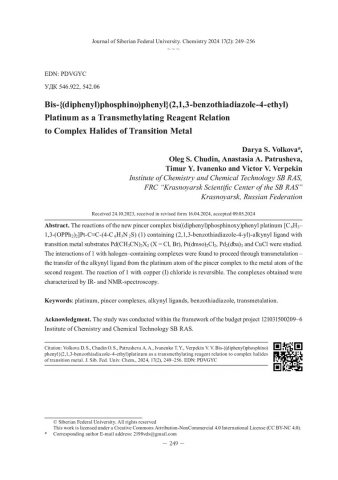 Библиографическое описание:Бис-{(дифенил)фосфинокси)фенил} (2,1,3-бензотиадиазол-4-этинил) платина как трансметаллирующий реагент по отношению к комплексным галогенидам переходных металлов = Bis-{(diphenyl)phosphino)phenyl}(2,1,3-benzothiadiazole-4-ethyl) Platinum as a Transmethylating Reagent Relation to Complex Halides of Transition Metal / Д. С. Волкова, О. С. Чудин, А. А. Патрушева [и др.]. - Текст : непосредственный // Журнал Сибирского федерального университета. Химия. - 2024. - Т. 17, № 2. - С. 249-256. - Библиогр.: с. 255-256 (29 назв.). - ISSN 1998-2836.