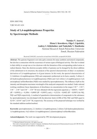 Библиографическое описание:Study of 1,4-naphthoquinones Properties by Spectroscopic Methods = Изучение свойств 1,4-нафтохинонов спектроскопическими методами / N. V. Aseeva, E. I. Korotkova, O. I. Lipskikh [et al.]. - Текст : непосредственный // Журнал Сибирского федерального университета. Химия. - 2024. - Т. 17, № 2. - С. 186-195. - Библиогр.: с. 194-195 (17 назв.). - ISSN 1998-2836.