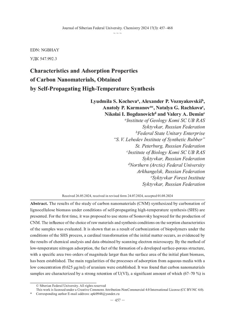 Библиографическое описание:Характеристика и адсорбционные свойства углеродных наноматериалов, полученных методом самораспространяющегося высокотемпературного синтеза = Characteristics and Adsorption Properties of Carbon Nanomaterials, Obtained by Self-Propagating High-Temperature Synthesis / Л. С. Кочева, А. П. Возняковский, А. П. Карманов [и др.]. - Текст : непосредственный // Журнал Сибирского федерального университета. Химия. - 2024. - Т. 17, № 3. - С. 457-468. - Библиогр.: с. 467-468 (14 назв.). - ISSN 1998-2836.