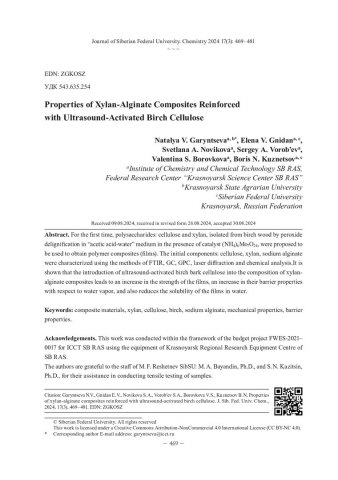 Библиографическое описание:Свойства ксилан-альгинатных композитов, армированных целлюлозой березы, активированной ультразвуком = Properties of Xylan-Alginate Composites Reinforced with Ultrasound-Activated Birch Cellulose / Н. В. Гарынцева, Е. В. Гнидан, С. А. Новикова [и др.]. - Текст : непосредственный // Журнал Сибирского федерального университета. Химия. - 2024. - Т. 17, № 3. - С. 469-481. - Библиогр.: с. 479-481 (20 назв.). - ISSN 1998-2836.