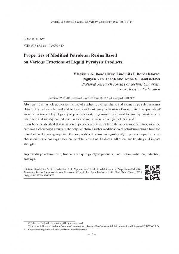 Библиографическое описание:Properties of Modified Petroleum Resins Based on Various Fractions of Liquid Pyrolysis Products = Свойства модифицированных нефтеполимерных смол на основе различных фракций жидких продуктов пиролиза / V. G. Bondaletov, L. I. Bondaletova, V. T. Nguyen , A. V. Bondaletova. - Текст : непосредственный // Журнал Сибирского федерального университета. Химия. - 2025. - Т. 18, № 1. - С. 5-14. - Библиогр.: с. 13-14 (16 назв.). - ISSN 1998-2836.