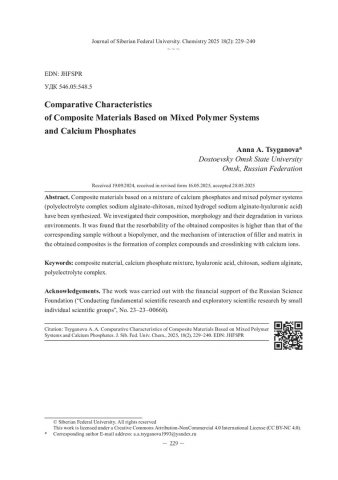Библиографическое описание:Цыганова, А. А. Сравнительная характеристика композиционных материалов на основе смешанных полимерных систем и фосфатов кальция = Comparative Characteristics of Composite Materials Based on Mixed Polymer Systems and Calcium Phosphates / А. А. Цыганова. - Текст : непосредственный // Журнал Сибирского федерального университета. Химия. - 2025. - Т. 18, № 2. - С. 229-240. - Библиогр.: с. 239-240 (20 назв.). - ISSN 1998-2836.