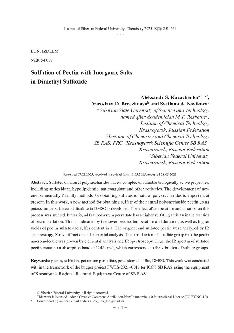 Библиографическое описание:Казаченко, А. С. Сульфатирование пектина неорганическими солями в диметилсульфоксиде = Sulfation of Pectin with Inorganic Salts in Dimethyl Sulfoxide / А. С. Казаченко, Я. Д. Бережная, С. А. Новикова. - Текст : непосредственный // Журнал Сибирского федерального университета. Химия. - 2025. - Т. 18, № 2. - С. 251-261. - Библиогр.: с. 259-261 (29 назв.). - ISSN 1998-2836.