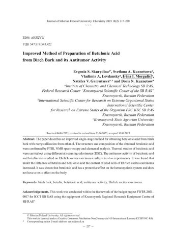Библиографическое описание:Усовершенствованный способ получения бетулоновой кислоты из бересты березы и её противоопухолевая активность = Improved Method of Preparation of Betulonic Acid from Birch Bark and its Antitumor Activity / Е. С. Скурыдина, С. А. Кузнецова, В. А. Левданский [и др.]. - Текст : непосредственный // Журнал Сибирского федерального университета. Химия. - 2025. - Т. 18, № 2. - С. 217-228. - Библиогр.: с. 227-228 (23 назв.). - ISSN 1998-2836.