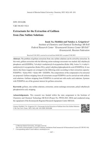 Библиографическое описание:Флейтлих, И. Ю. Экстрагенты для извлечения галлия из сернокислых цинковых растворов = Extractants for the Extraction of Gallium from Zinc Sulfate Solutions / И. Ю. Флейтлих, Н. А. Григорьева. - Текст : непосредственный // Журнал Сибирского федерального университета. Химия. - 2025. - Т. 18, № 3. - С. 445-454. - Библиогр.: с. 452-454 (17 назв.). - ISSN 1998-2836.