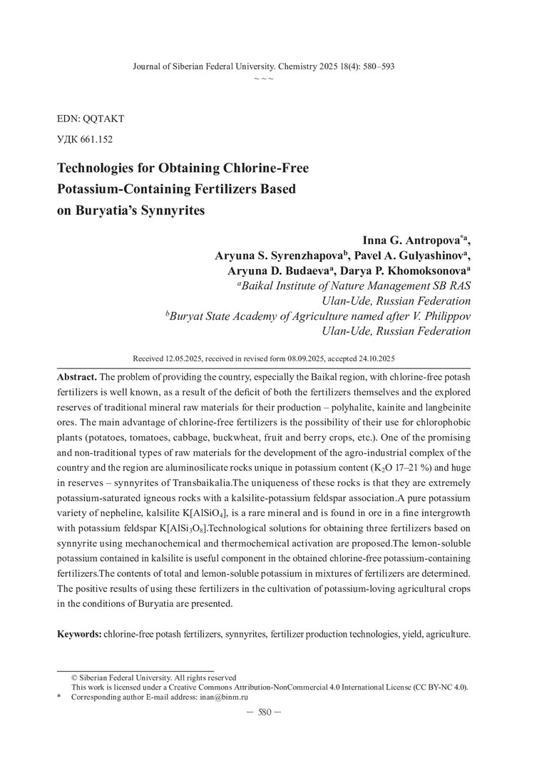 Библиографическое описание:Технологии получения бесхлорных калийсодержащих удобрений на основе сынныритов Бурятии = Technologies for Obtaining Chlorine-Free Potassium- Containing Fertilizers Based on Buryatia’s Synnyrites / И. Г. Антропова, А. С. Сыренжапова, П. А. Гуляшинов [и др.]. - Текст : непосредственный // Журнал Сибирского федерального университета. Химия. - 2025. - Т. 18, № 4. - С. 580-593. - Библиогр.: с. 591-593 (28 назв.). - ISSN 1998-2836.