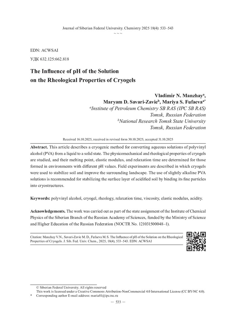 Библиографическое описание:Манжай, В. Н. Влияние рН среды раствора на реологические свойства криогелей = The Influence of pH of the Solution on the Rheological Properties of Cryogels / В. Н. Манжай, М. Д. Савари-Завие, М. С. Фуфаева. - Текст : непосредственный // Журнал Сибирского федерального университета. Химия. - 2025. - Т. 18, № 4. - С. 533-543. - Библиогр.: с. 541-543 (25 назв.). - ISSN 1998-2836.