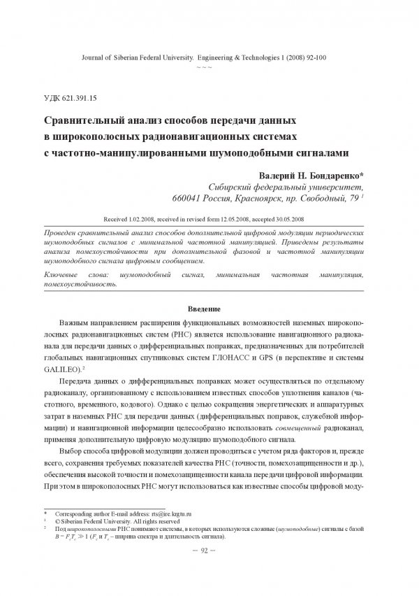 Аннотация:Проведен сравнительный анализ способов дополнительной цифровой модуляции периодических шумоподобных сигналов с минимальной частотной манипуляцией. Приведены результаты анализа помехоустойчивости при дополнительной фазовой и частотной манипуляции шумоподобного сигнала цифровым сообщением.