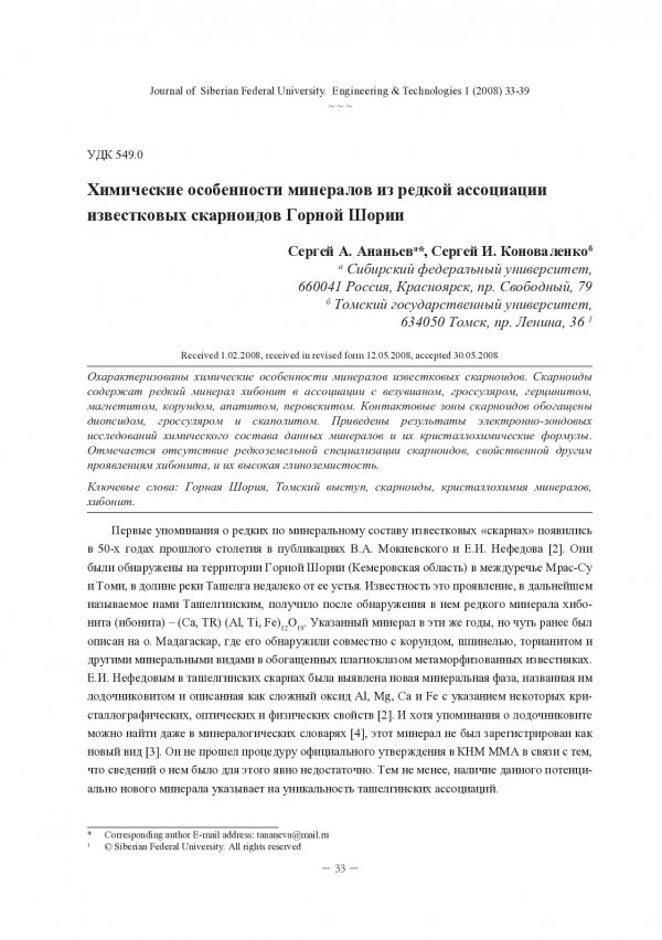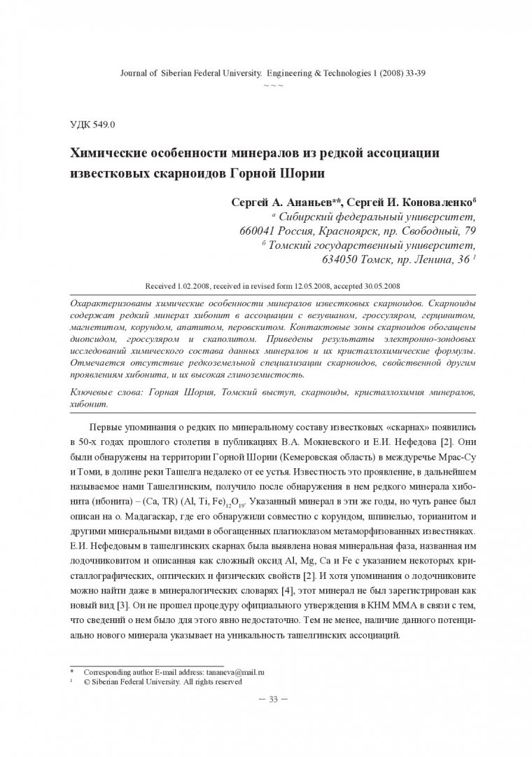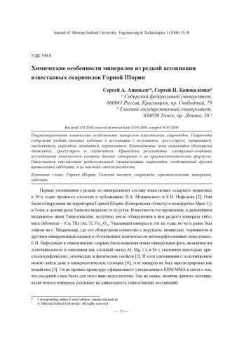 Библиографическое описание:Коноваленко, Сергей И... Химические особенности минералов из редкой ассоциации известковых скарноидов Горной Шории = Chemical Peculiarities of Minerals from the Rare Calciferous Scarnoid Association of the Gornaya Shoria / С. И. Коноваленко, С. А. Ананьев. - Текст : непосредственный // Журнал Сибирского федерального университета. Техника и технологии. - 2008. - Т. 1, № 1. - С. 33-39. - Библиогр.: с. 38. - ISSN 1999-494X.