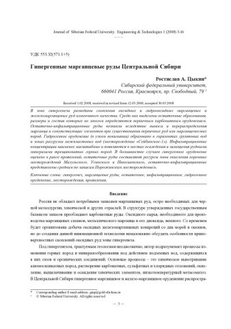 Библиографическое описание: Цыкин, Ростислав А... Гипергенные марганцевые руды Центральной Сибири = Hypergene Manganese Ores of Central Siberia / Р. А. Цыкин. - Текст : непосредственный // Журнал Сибирского федерального университета. Техника и технологии. - 2008. - Т. 1, № 1. - С. 3-16. - Библиогр.: с. 15-16. - ISSN 1999-494X.