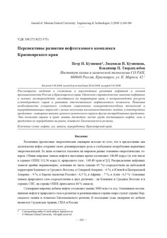 Библиографическое описание: Кузнецов, Петр Н... Перспективы развития нефтегазового комплекса Красноярского края = Development Prospects of Oil and Gas Processing Complex in the Krasnoyarsk Region / П. Н. Кузнецов, Л. И. Кузнецова, В. П. Твердохлебов. - Текст : непосредственный // Журнал Сибирского федерального университета. Техника и технологии. - 2008. - Т. 1, № 2. - С. 168-180. - Библиогр.: с. 178-180. - ISSN 1999-494X.