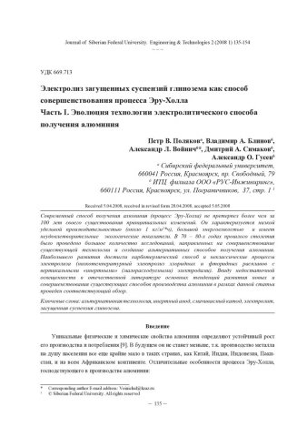 Библиографическое описание: Электролиз загущенных суспензий глинозема как способ совершенствования процесса Эру-Холла Часть I. Эволюция технологии электролитического способа получения алюминия = Electrolysis of Thickened Alumina Slurry as a Method of Hall-Heroult Process Update Part I. Evolution of Electrolytic Aluminium Production Method / П. В. Поляков, В. А. Блинов, А. Л. Войнич [и др.]. - Текст : непосредственный // Журнал Сибирского федерального университета. Техника и технологии. - 2008. - Т. 1, № 2. - С. 135-154. - Библиогр.: с. 150-153. - ISSN 1999-494X.