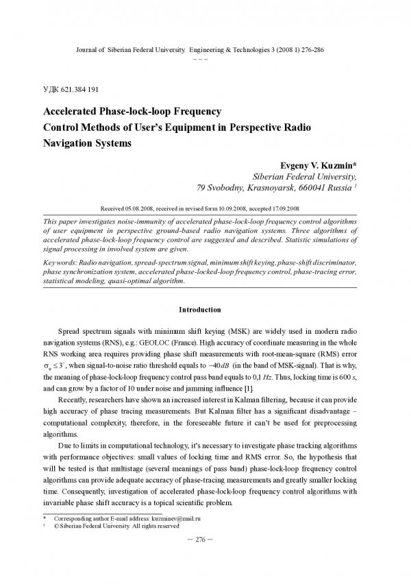Библиографическое описание:Kuzmin, Evgeny V... Accelerated Phase-lock-loop Frequency Control Methods of User’s Equipment in Perspective Radio Navigation Systems = Ускоренные методы управления частотой фазовой автоподстройки частоты пользовательского оборудования в перспективных радионавигационных системах / E. V. Kuzmin. - Текст : непосредственный // Журнал Сибирского федерального университета. Техника и технологии. - 2008. - Т. 1, № 3. - С. 276-286. - Библиогр.: с. 285-286. - ISSN 1999-494X.
