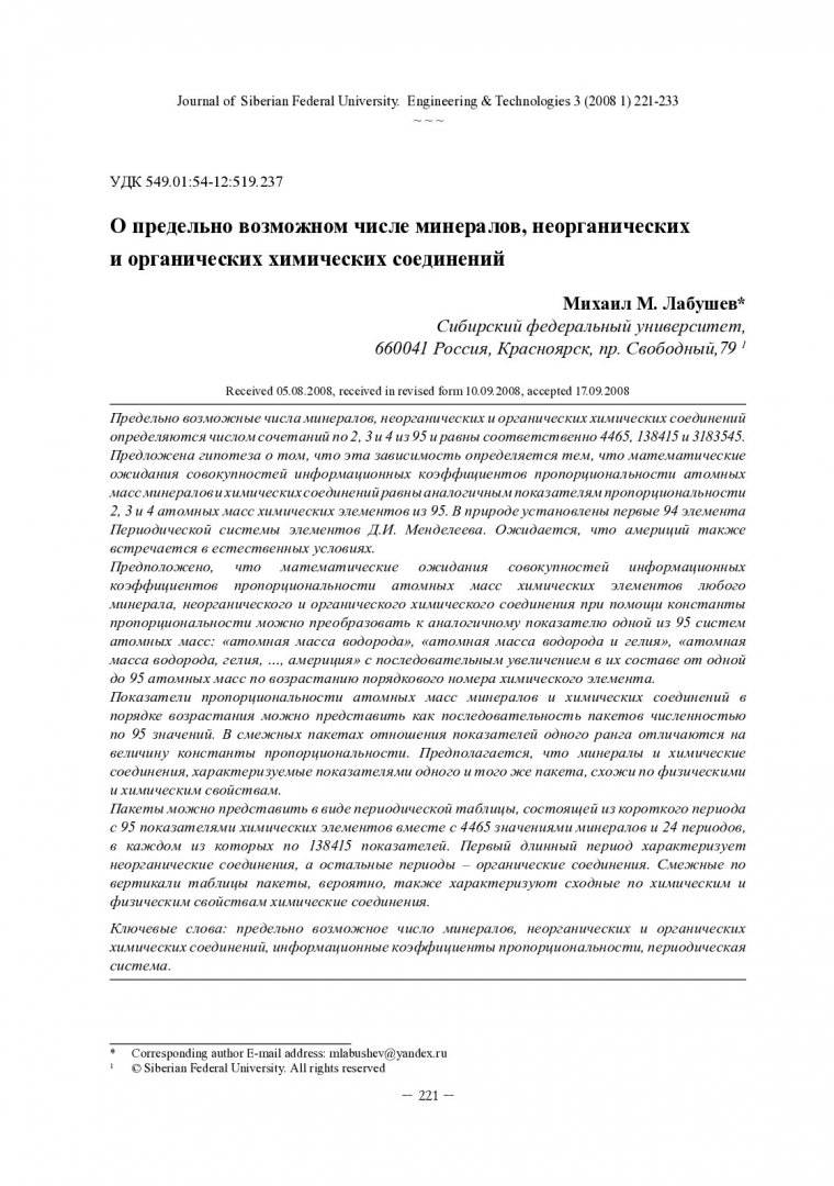Библиографическое описание: Лабушев, Михаил М... О предельно возможном числе минералов, неорганических и органических химических соединений = About Limit Numbers of Minerals, Inorganic and Organic Chemical Compounds / М. М. Лабушев. - Текст : непосредственный // Журнал Сибирского федерального университета. Техника и технологии. - 2008. - Т. 1, № 3. - С. 221-233. - Библиогр.: с. 231. - ISSN 1999-494X.